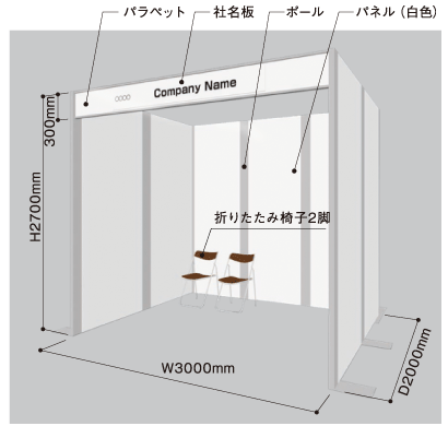 - 但し角小間の場合は通路側のパネルは付きません。(必要な場合は、出展社の費用負担となります。)